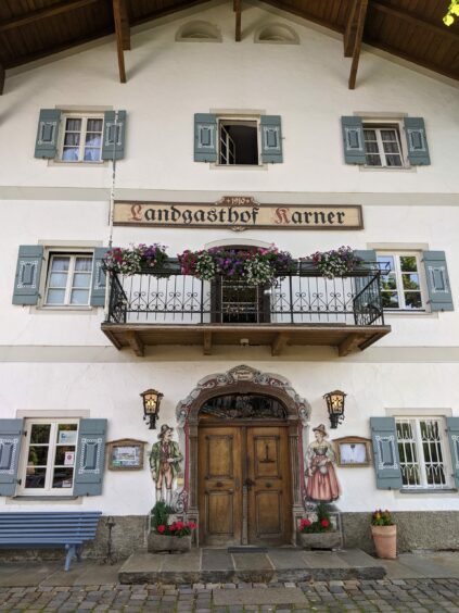 Foto Haus – Der stattliche zweigeschossige Bau ist eine schöne Ergänzung zum Ortsbild. Der blumengeschmückte Balkon mit seinem schmiedeeisernen Geländer, die mit dezenten Farben bemalenen Fensterläden, sowie die Heiligennische und das dekorative Nasenschild an der Nordwestecke prägen die Giebelfront. Über dem Balkon ist eine Tafel angebracht mit der Inschrift: 1910 – Landgasthof Karner – 1982 (Das sind die Zeiten, in denen die Familien Niederauer Besitzer waren). Absolut einladend wirkt auch das großzügige Eingangsportal mit seiner schön geschnitzten, zweiflügeligen Türe. Die gläserne Oberlichte ist, wie bei den meisten Türen dieser Art, mit einem geschmiedeten Gitter mit einem in der Mitte eingearbeiteten Jesusmonogramm I H S, geschützt. In der Malerei am Segmentbogen über dem Portal steht ebenfalls der Name Landgasthof Karner.