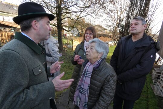 Foto 3 (mmü): Der bayerische Wirtschaftsminister, stellvertretende Ministerpräsident und FW-Chef Hubert Aiwanger im regen Austausch mit der Seniorchefin der Wasserkraftanlage Höllthal Marianne Holzner und den Chefs Ralf Holzner und Marion Baumann.