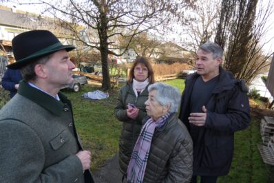 Foto 2 (mmü): Der FW-Fraktionsvorsitzende im Bayerischen Landtag Florian Streibl im Gespräch mit Ralf Holzner und Marion Baumann, den Chefs der Wasserkraftanlage Höllthal.