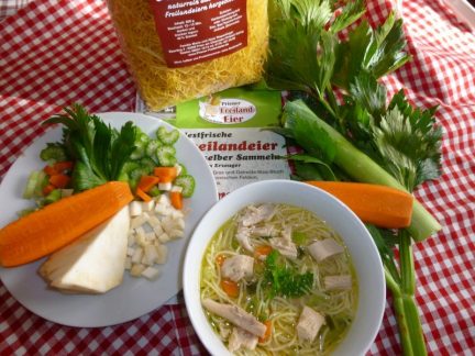 Das Rezept von Bäuerin Maria Riepertinger liegt im Hofladen zum mitnehmen aus. Außerdem findet man es unter folgendem Link: priener-freilandeier.de/html/huhnersuppe.html