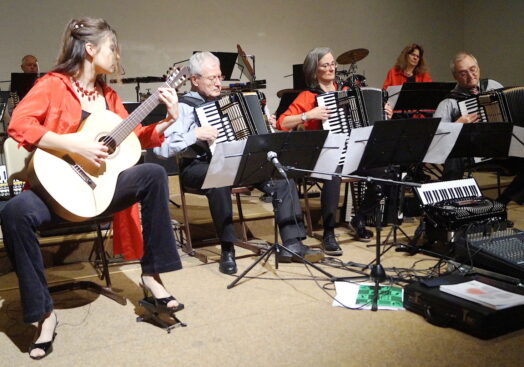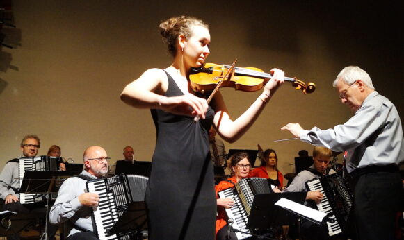 Es folgten Werke aus der Filmmusik, wie „Be Our Guest“ aus „The Beauty and the Beast“ von Alan Menken, schwungvoll dirigiert von Claudia Kneidl, außerdem „Under the Sea“ aus „The Little Mermaid“ mit Klängen, die an ein Xylophon erinnerten. Bei „Rhythmischen Impressionen“, wo der „Intercity“ von Adolf Götz mit Saxofonklang vom Akkordeon durch verschiedene Genres bis hin zum Walzer rauscht, oder auch beim Disco Samba „For Once in My Life“ und „I Go to Rio“ im Clave-Rhythmus, ebenso wie beim Rock-Klassiker „MacArthur Park“ von Jimmy Webb und dem Foxtrott „Goody Goody“ mit Bezug zu Benni Goodman zeigten die Akkordeonisten präzises Zusammenspiel und eine feine Klangkultur.