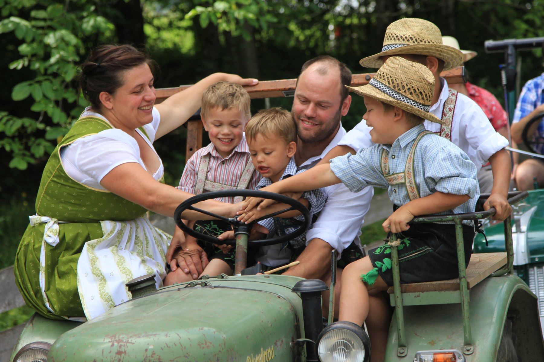 Freude am Fahren – Familie Schwarz aus Schlehdorf ist mit ihrem Fendt Dieselross Baujahr 1954 genauso wieder mit dabei wie 2014, als das Foto entstanden ist. Bildquelle: Bezirk Oberbayern, Archiv Freilichtmuseum Glentleiten, Foto: Bönisch.