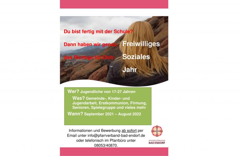 Der Pfarrverband Bad Endorf sucht ab kommenden September bis August 2022 Jugendliche und junge Erwachsene für ein freiwilliges soziales Jahr. Die Aufgaben beinhalten Gemeinde-, Kinder- sowie Jugendarbeit, unter anderem Mithilfe bei Erstkommunion, Firmung oder bei der Betreuung von Spielgruppen.