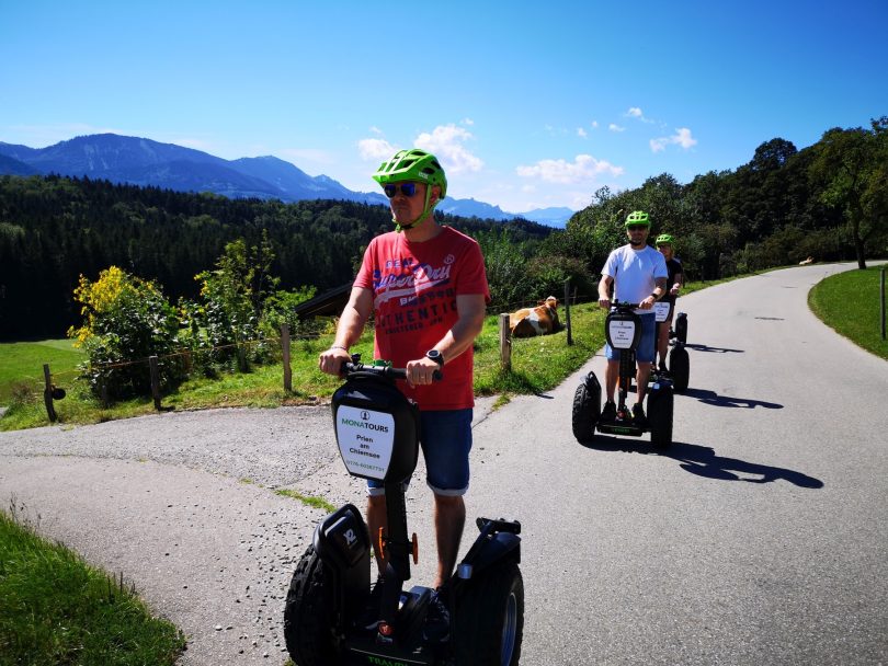 Noch bis Oktober 2022 hat man immer mittwochs die Möglichkeit auf einer abenteuerlichen Panoramafahrt das hügelige Umland von Prien am Chiemsee zu erkunden. Ausgerüstet mit Segways, elektrisch angetriebene Einpersonen-Fahrzeuge, und einem professionellen Guide fahren die Teilnehmer:innen auf einer abwechslungsreichen Wegstrecke entlang einer Anhöhe zwischen der Ratzinger Höhe und den Chiemgauer Bergen.