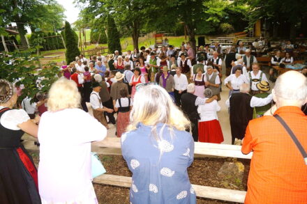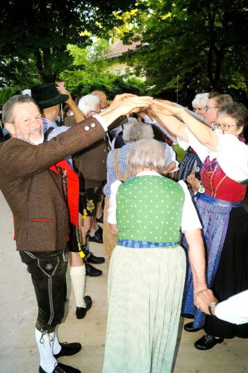 Den Auftakt bildete der traditionelle Auftanz, eine festliche Polonaise, bei der sich die Tanzpaare in einer langen Schlange aneinanderreihten. So viele Besucher waren zum Maxlrainer Morgentanzl gekommen, dass Tanzleiter Christian Hengstberger die Paare gleich zweimal durch den gesamten Biergarten führen musste, um auf der Tanzfläche genügend Raum für die folgenden Formationen zu schaffen – ein deutliches Zeichen der Lebendigkeit und Beliebtheit der Veranstaltung.. Die lange Reihe schlängelte sich zwischen Tischen und schattigen Kastanien hindurch, begleitet vom Klang der Aichacher Bauernmusi. Danach spielten die Aichacher vier Stunden lang unermüdlich Tanzrunde auf Tanzrunde – ein Wechselspiel aus Walzer, Polka, Boarischem und traditionellen Figurentänzen. Einige Zweifache mit ihrem Wechsel zwischen Zwei- und Dreivierteltakt sowie ab und zu ein Blick über den Zaun in die österreichische Volkstanzlandschaft waren wie eine Prise Salz in der Suppe.