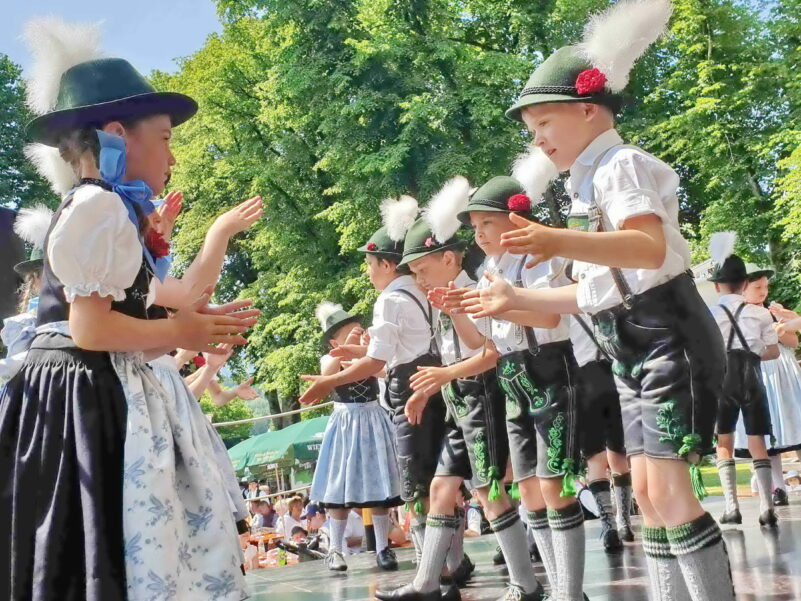 An die vierzig Kinder zwischen fünf und elf Jahren in fescher Tracht tummelten sich beim Frühlingsfest des Trachtenvereins d’Raschenberger Teisendorf auf der Bühne und tanzten die Sternpolka und das Bauernmadl. Die neue mobile Bühne war für so viele Tänzerinnen und Tänzer fast zu klein und dennoch klappte alles sehr gut. Für die Kinder sind solche öffentlichen Auftritte gerade jetzt sehr willkommen, denn das Gaufest steht vor der Tür und darauf bereiten sich nicht nur die Großen, sondern auch die Nachwuchstrachtler vor. Die Vorfreude und Anspannung wächst auch bei Kinder und Jugendlichen mit jedem Tag.
