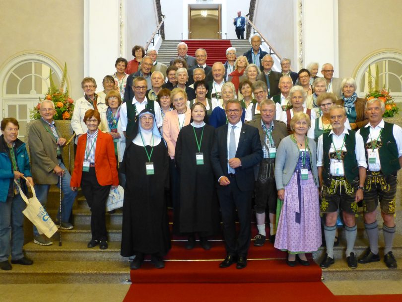 Foto: Bock – Bildungsfahrt mit dem Freundeskreis der Benediktinerinnen-Abtei Frauenwörth im Chiemsee e.V. in den Landtag. Im Empfangsbereich stellen sich die Teilnehmerinnen und Teilnehmer dem Fotografen. Erste Reihe Bildmitte Schwester Elisabeth und Schwester Hanna, re daneben Klaus Stöttner, MdL und stellvertretender Vorsitzender, zwischen beiden Schwestern dahinter Annemarie Biechl MdL a.D. Vorsitzende des Freundeskreises.