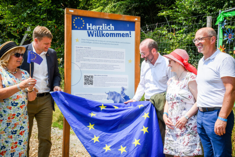 Der „Europas-Werte-Wanderweg“ ist eine Wanderausstellung im doppelten Sinn. Einerseits werden die acht Informationstafeln so aufgestellt, dass man sie bei einer kleinen Wanderung erkunden kann. Andererseits bleibt die Ausstellung, die von der Bürgerbewegung „Europa-Union Bayern“ konzipiert wurde, etwa vier Wochen an einem Ort und zieht dann weiter. Am Sonntagnachmittag wurde sie auf der Bayerischen Landesgartenschau eröffnet – und das von einem, der sich tagtäglich für Europas Werte einsetzt und politisch seit Jahren dafür kämpft: Manfred Weber, der Vorsitzende der europäischen Volkspartei (EVP) und zugleich ihr Fraktionsvorsitzender im Europaparlament.