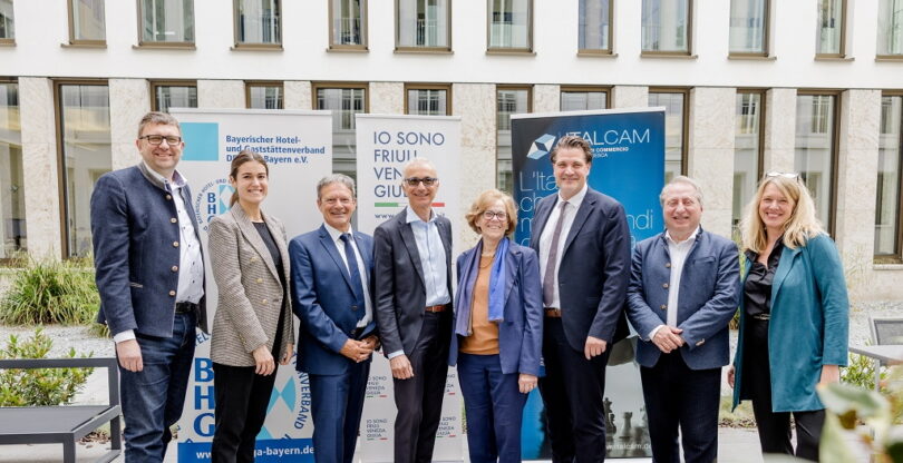 Bericht: DEHOGA Bayern / Foto: Loredana La Rocca – Friaul-Julisch Venetien zu Gast in Bayern (v.l.): Thomas Quiram, Regionalgeschäftsführer des DEHOGA Bayern-Bezirks Oberbayern, Mara Micolino, Vertreterin Promoturismo FVG, Reiner Hebermehl, Leiter des DEHOGA Bayern-Forums Italienische Gastgeber, Alessandro Marino, Geschäftsführer ITALCAM, Annamaria Andretta, Präsidentin ITALCAM, DEHOGA Bayern-Landesgeschäftsführer Dr. Thomas Geppert, Sergio Maffettone, Italiensicher Generalkonsul München, Susanne Wess, Food-Expert und Journalistin.