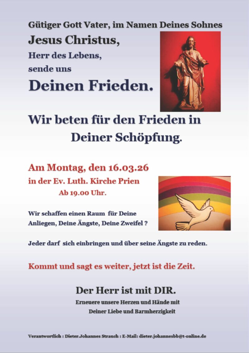 In Zeiten globaler und persönlicher Unsicherheit lädt die Evangelisch-Lutherische Kirchengemeinde Prien zu einem besonderen Abend des Gebets und des Austauschs ein. Unter dem Leitgedanken „Wir beten für den Frieden in Deiner Schöpfung“ findet am Montag, den 16. März 2026, eine Zusammenkunft statt, die Raum für Spiritualität und Gemeinschaft bietet.
