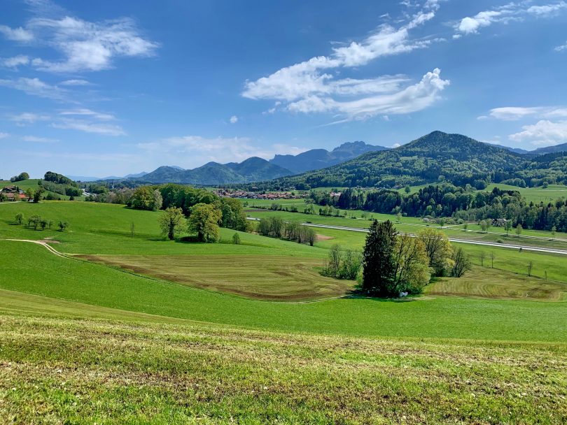 Trotz einladendem Frühjahrs-Sonnenwetter hielten sich in diesen Tagen die Bewohner Bayerns in der Regel an die Regelungen, die zu Reiseeinschränkungen anläßlich der Corona-Krise notwendig sind. Ein sichtbares und gutes Beispiel ist der Blick von oberhalb von Frasdorf über die ansonsten volle Autobahn München-Salzburg, die derzeit nur wenig befahren ist, hinüber zur Nachbargemeinde Aschau mit der landschaftsprägenden Kampenwand.