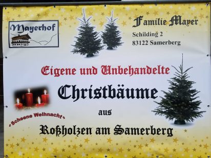 Frisch geerntet aus Wäldern von Rossholzen am Samerberg gibt es ab sofort Christbäume in verschiedenen Größen vom Hof der Familie Bartholomäus Mayer in Schilding am Samerberg. Die ungespritzten und unbehandelten Bäume sind erhältlich auf dem Hof in Samerberg-Schilding, Telefon 08032-8722, in Nussdorf am Inn (Margreiter) und in Höhenmoos (Thalham) sowie am Dritten Adventsonntag, 16. Dezember beim Dorfadvent in Törwang von mittags bis ca. 18 Uhr.