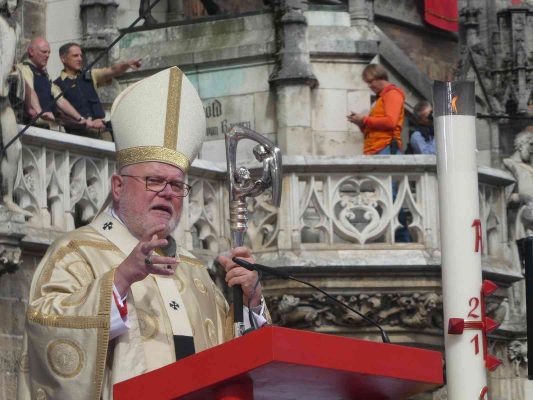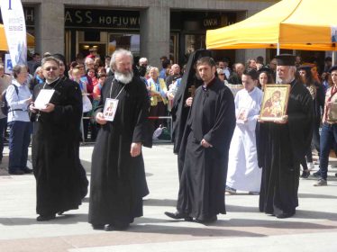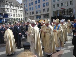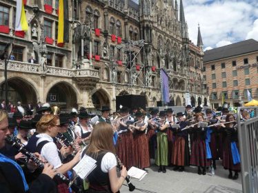 Seit 2011 pilgern Gläubige jedes Jahr an einen Marienwallfahrtsort in einer bayerischen Diözese. Von allen sieben Diözesen und in München aus allen Himmelsrichtungen trafen nunmehr die Gruppen der Betenden mit festlicher Musik und mit ihren Fahnenabordnungen ein – ein außergewöhnliches und fröhliches Bild, das sich den zahlreichen Münchnern und ihren Gästen zeigte. Weihbischof Wolfgang Bischof von der Seelsorgesregion Süd als Beauftragter der Jubiläums-Wallfahrt mit dem Motto „Mit Maria auf dem Weg – Mitten im Leben“ hieß die große Pilgerschar mit ökumenischem Geist willkommen, unter ihnen waren -unter anderem- als oberster Vertreter des Hauses Wittelsbach Herzog Franz von Bayern, Bayerns Ministerpräsident Horst Seehofer, Landtagspräsidentin Barbara Stamm, Innenminister Joachim Herrmann sowie Münchens Bürgermeister Josef Schmid. Kardinal Marx begann den Gottesdienst mit den Worten: „Mit dem Heiligen Vater, der in Fatima weilt, sind wir im Zeugnis des Friedens verbunden. Erinnern wir uns daran, dass König Ludwig III mitten im Krieg die Bitte äußerte, Maria zur Patronin des wunderschönen Landes zu machen, seien wir mit Maria verbunden, sie lädt uns ein, auf Christus zu schauen“. In seiner Predigt sagte dann der Kardinal: „Die österliche Freude ist eine große Explosion des Glaubens, denn die Botschaft von Ostern sagt uns, dass ER lebt, ER ist lebendig, Er ist der Weg, ER ist die Wahrheit und Er ist das Leben“. Und zu Maria, der Mutter Gottes sagte er: „Kein Weg der Kirche kann ohne Maria gegangen werden, durch Maria lernen wir den Weg der Zuversicht, 100 Jahre Marien-Schirmherrschaft bedeuten Hoffnung für Leben, für die Politik, für die Wissenschaft und Wirtschaft, für die Kultur, für die Caritas, für die Flüchtlinge und für die Kranken“. In seinen weiteren Ausführungen bat Kardinal Marx, auf die Worte Marias zu hören, denn Gott ist ein Kind Mariens geworden und damit Bruder aller Menschen. Mit „100 Jahre Fatima“ und „100 Jahre Patrona Bavariae“ ist die Wallfahrt zu Ehren der Gottesmutter noch nicht zu Ende. „Diese Wallfahrt sowie unser Bitten, Beten und Danken gehen nie zu Ende, Maria geht immer mit uns“ mit diesen Worten und mit der Bitte „Heilige Mutter Gottes, Patrona Bavariae, bitte für uns jetzt und in der Stunde unseres Todes, segne das Land Bayern“ schloss Kardinal Marx die Predigt auf dem Marienplatz. Die musikalische Gestaltung der Messfeier und Marienweihe an der Mariensäule übernahmen Chöre aus dem Diözesanverband der PUERI CANTORES , die Domsingschulen München und Freising, der Chor „Cantores iuvenes Sti. Sebastiani Ebersberg“, die Pfarrsingschule St. Martin-Germering, Domorganist Msgr. Hans Leitner an der Orgel, die Münchner Dombläser unter der Leitung von Benedikt Celler, Blaskapellen aus Ober- und Niederbayern sowie der Chor der Auferstehungsgemeinde in München und die Russische Orthodoxe Kirche (Moskauer Patriarchat) unter der Leitung von Maxim Matiuschenkov. Zum fröhlichen und farbigen Gesamtbild trugen die zahlreichen Fahnen-, Standarten- und Banner-Abordnungen der bayerischen Trachtler, der Gebirgsschützen sowie vieler kirchlicher Gemeinschaften bei, die aus allen bayerischen Landesteilen in die Mitte der Hauptstadt kamen. Das vom Wetter und weiß-blauem Himmel begünstigte Fest beeindruckte viele Zaungäste und Zuschauer, ein Gast aus Südamerika sagte in gutem Deutsch: „Wundervoll, wenn der Glauben so fröhlich und friedlich gezeigt wird, wäre es nur so überall auf der Welt“, und Helmut Trinkberger aus Erding, der sich wegen der S-Bahn-Stammstrecken-Sperrung die Übertragung vom Bayerischen Fernsehen daheim anschaute, meldete sich gleich hernach mit den Worten „Des war wieda a moi wos füas Herz!“.