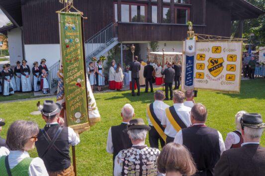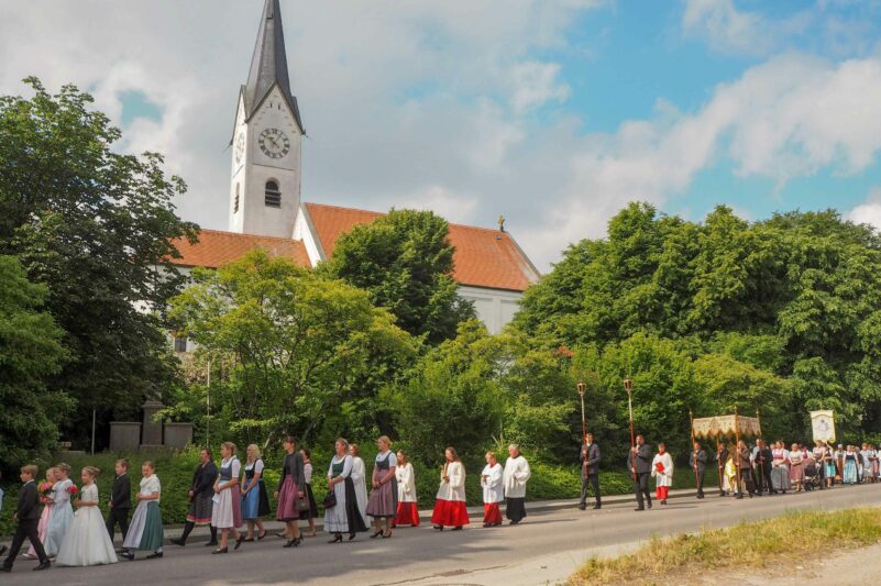 Musikalisch umrahmten die Messe der Kirchenchor der Stadtteilkirche-Am Wasen unter Leitung von Andreas Penninger und die Wasner Musi mit Hans Rutz. Prächtig war die Prozession, die im Anschluss durch die Stadtteile Pang und Aising zog. Unter dem Baldachin trug Fabian Orsetti, Pfarrer von Stadtteilkirche-Am Wasen und Pfarrverband Stephanskirchen, die Monstranz. Ihn begleiteten zahlreiche Ortsvereine samt Fahnenabordnungen, die Zunftstangen mit Blumen der Katholischen Landjugendbewegung Aising-Pang, die Ministranten, einige Erstkommunionkinder, Paul Deutschenbaur, Vorsitzender des Rosenheimer Dekanatsrats, sowie die Stadträte Georg Kaffl, Anna Rutz, Reinhard Tomm, Josef Gasteiger und Monika Fischbacher.