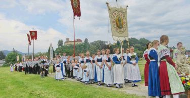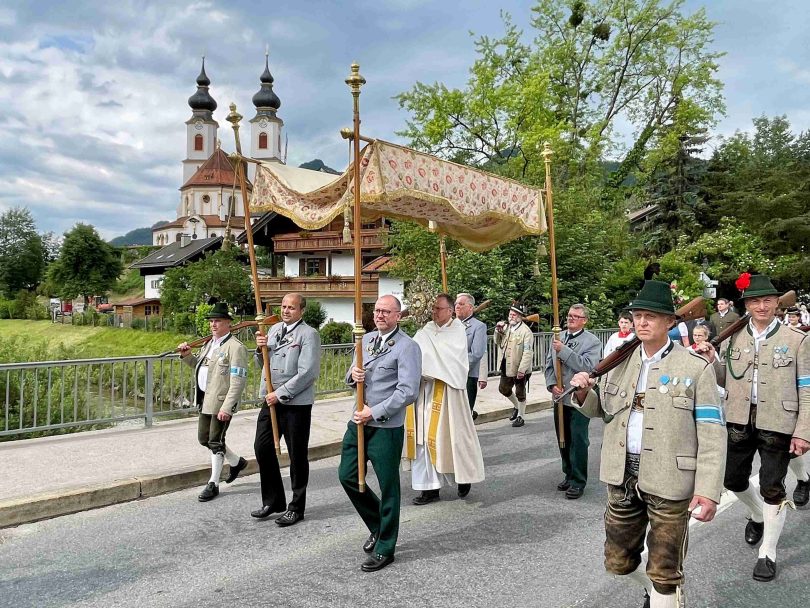 Nach zwei Jahren die der Pandemie geschuldet waren, gab es in diesem Jahr zum Hochfest Fronleichnam am Fuße der Kampenwand wieder eine Prozession. Betend und singend zog die Fronleichnamsprozession der Pfarrgemeinde von Aschau i.Chiemgau mit Baldachin, den Fahnen der Dorfvereine, den Vereinen und der Musikkapelle durch den blumen- und fahnengeschmückten Ortskern. Der Prozession ging der Festgottesdienst in der katholischen Aschauer Pfarrkirche „Darstellung des Herrn“ voraus. Ortspfarrer Paul Janßen segnete mit dem Allerheiligsten das Dorf, die Werkstätten, die Schule sowie die Fluren und Felder. Die zwei aufgebauten Altäre wurden vom Katholischen Frauenbund und von der Kolpingfamilie hergerichtet. Die Gebirgsschützenkompanie Aschau gab dabei das Ehrengeleit. Die aktiven Dirndl der beiden örtlichen Trachtenvereine Hohenaschau und Niederaschau trugen die Madonnenfigur und das Standbild der heiligen Notburga bei der Prozession. Im Mittelpunkt stand das Brot, das symbolisch in der goldenen Monstranz durch den Ort getragen wurde. Vier Himmelträger flankierten Pfarrer Paul Janßen und dahinter folgte die Kirchengemeinde.