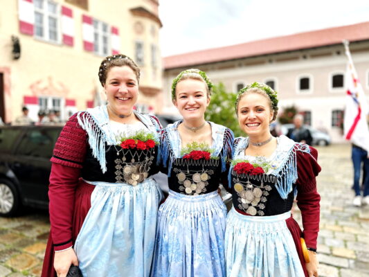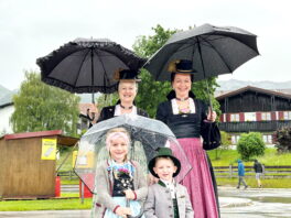 u.a. Familie Hofmann vom Trachtenverein D` Griabinga Hohenaschau am Fronleichnamstag auf dem Weg zum Kirchgang in Aschau i.Chiemgau – Hinten stehend: Oma Andrea Hofmann (links), Schwiegertochter Anna Hofmann (rechts stehend) mit ihren Kindern Magdalena und Lorenz jun. Hofmann