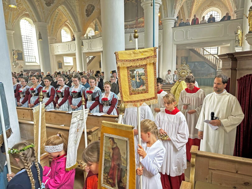 Die Fahnen der Dorfvereine, die festlich gekleideten Vereinsmitglieder beider örtlichen Trachtenvereine, die Gebirgsschützenkompanie Aschau, die Feuerschützen und Gläubige sind gekommen um zusammen mit Ortspfarrer Paul Janßen diesen besonderen Feiertag mit einem Gottesdienst zu begehen. Die Kinder der Pfarrgemeinde haben Fahnen getragen und sind zusammen mit den Ministranten und Geistlichkeit zu den beiden Seitenaltären gezogen. Am Rosenkranzaltar und am Johannes-Nepomuk-Altar wurde das mitgetragene Allerheiligste in der Monstranz angebetet und im Gebet und Gesang Station gemacht. Im Mittelpunkt stand dabei das Brot. Für den musikalischen Rahmen sorgte der Aschauer Kirchenchor mit der Aufführung der Alpenländischen Messe von Leonhard Maierhofer. Die musikalische Leitung lag bei Kirchenmusikerin Christine Klinger an der Orgel und Rupert Schäfer an der Geige.