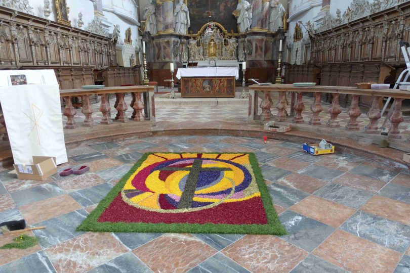 Bahnt dem Herrn den Weg! Aus diesem Gedanken heraus entstand einst der Brauch, an Fronleichnam kunstvolle Blumenteppiche mit christlichen Motiven vor den Altären zu gestalten. Heutzutage wird diese Tradition in immer weniger Pfarrgemeinden gepflegt. Dieser Blumenteppich entstand gestern in der ehemaligen Klosterkirche St. Margareta in Baumburg, einem Ortsteil der Gemeinde Altenmarkt an der Alz. Gute vier Stunden dauert es, bis der Teppich aus winzigen Blumenschnippsel gelegt war. Verwendet werden dazu Blumen, die man um die Kirche herum finden kann in frischer und getrockneter Form: unter anderem Akeleien, Pfingstrosen und Zierkirschen. Der grüne Rand entstand aus Gras. Etwa drei bis vier Wochen kann das natürliche Gemälde jetzt bewundert werden.