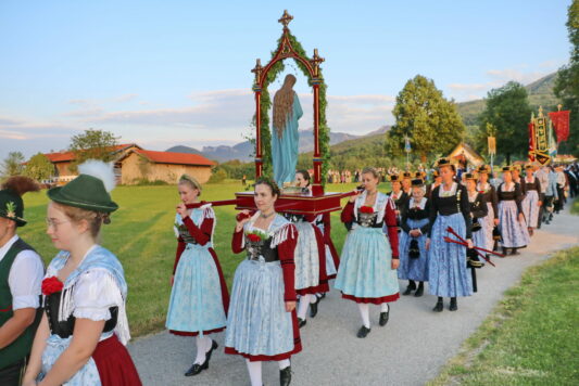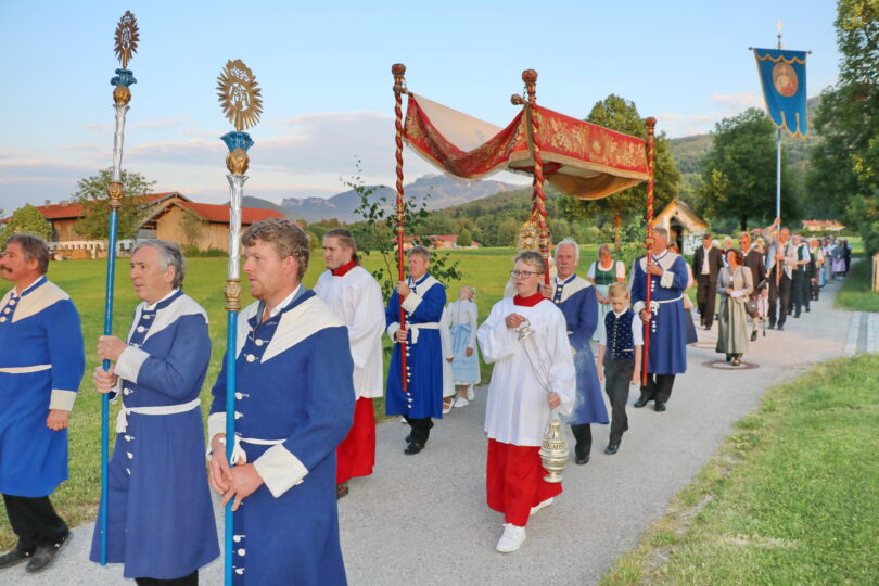Fronleichnam in Frasdorf – der Prangertag machte seinem alten Namen alle Ehre: Pfarrer Paul Janßen – geleitet von den Consultoren der Frasdorfer Bruderschaft – segnete mit dem Allerheiligsten das festlich geschmückte Dorf und seine Bewohner, die Fluren und Felder.