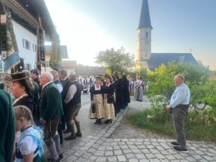 Pfarrvikar Amit Sinha Roy führte die Prozession unter dem sogenannten „Himmel“ an. Begleitet wurde er von den Ortsvereinen, den Fahnenabordnungen und vielen Trachtenträgern. Die festlich geschmückten Altarstationen, darunter die Gedächtniskapelle mit dem beeindruckenden Blick auf den Chiemsee, bildeten den feierlichen Rahmen für die Andacht.