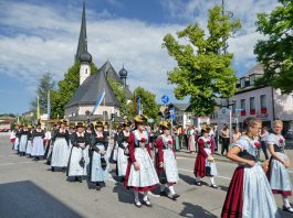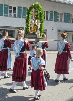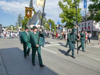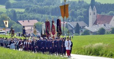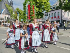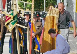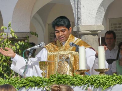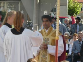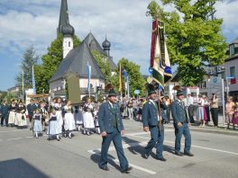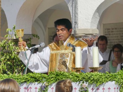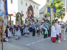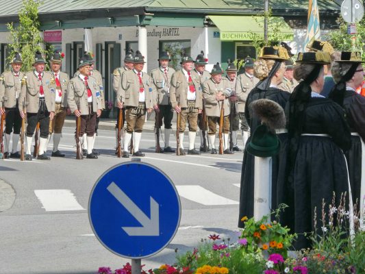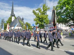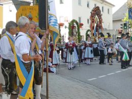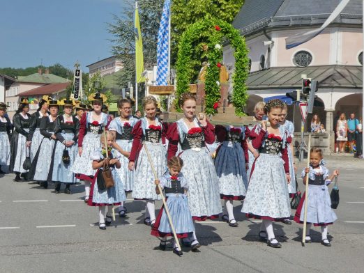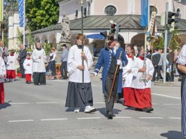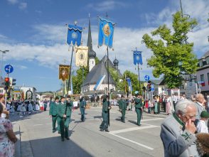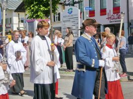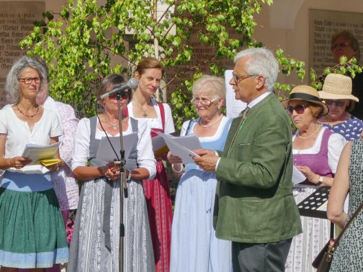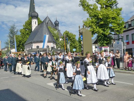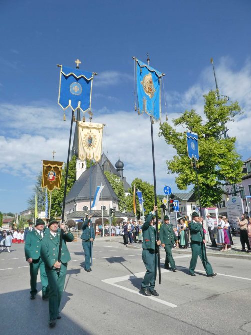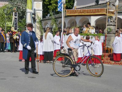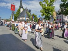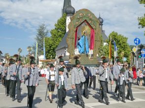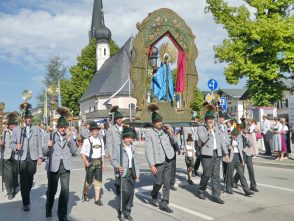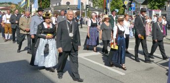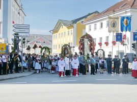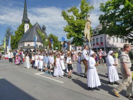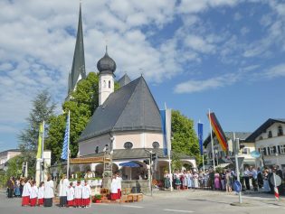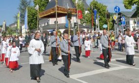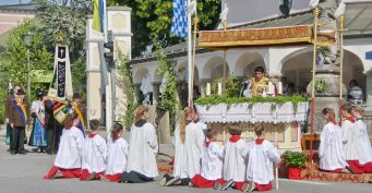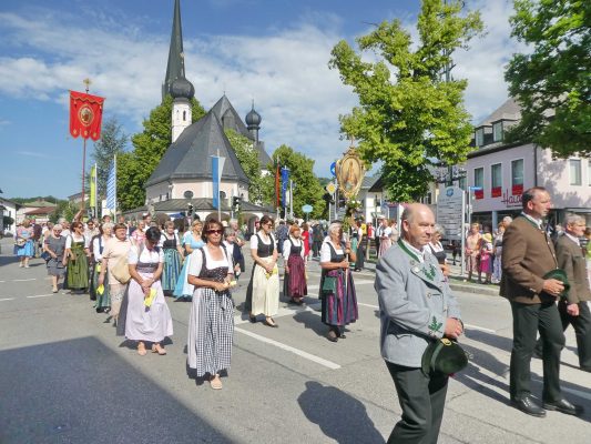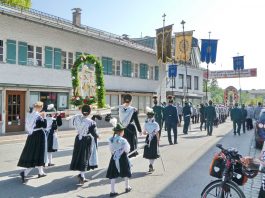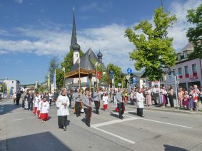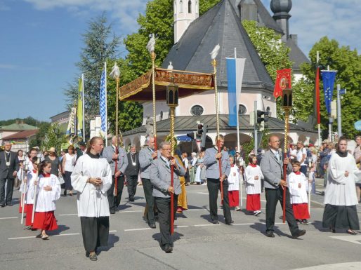 Zum festlichen Charakter der Fronleichnams-Feierlichkeiten in der Pfarrgemeinde „Maria Himmelfahrt“ in Prien haben neben dem Sonnenwetter unter weiß-blauem Himmel viele Kräfte beigetragen. Besonders der große liturgische Dienst mit Kaplan Joshy, der in der Gestaltung auf dem Priener Marktplatz musikalisch unterstützt wurde durch den Kirchenchor unter der Leitung von Kirchenmusiker Rainer Schütz und durch die Blaskapelle Prien mit ihrem Dirigenten Stefan Fußeder. Ordnungsaufgaben übernahm mit Ruhe und Übersicht der Kirchenschweizer Günter Kraus, unter anderem als sich ein Radfahrer nicht an die geänderten Verkehrsführungen halten wollte und unmittelbar vor dem Altar auftauchte. Die Prozessionsordnung war bereits im Vorfeld festgelegt, den Anfang machten Kreuzträger, Kinder, Jugendliche und Kolpingfamilie. Es folgten die Kirchen- und Vereinsfahren, die Trachtenvereine Prien, Greimharting und Atzing mit den Immaculata-, Bruderschafts- und Salvator-Figuren, die Feuerwehr und die Gebirgsschützen, die Blaskapelle, der Kirchenchor, die Ordensschwester und die Kommunionkinder. Hinter diesen folgten die Ministranten und der Altardienst mit Kaplan Joshy, dem Allerheiligsten und den Himmels-Trägern. Dahinter waren die drei Bürgermeister Jürgen Seifert, Hans-Jürgen Schuster und Alfred Schelhas mit weiteren Mitgliedern des Marktgemeinderates, Ehrengäste, Mitglieder der Kirchenverwaltung und des Pfarrgemeinderates, die Krieger- und Soldatenkameradschaft, der Katholische Frauenbund, Drittordens-Mitglieder und viele weitere Pfarrangehörige. Vom Marktplatz zog der große Prozessionszug über die Hochries- und Wendelsteinstraße zum Rathaus und nach dortigen Gebeten und Gesängen weiter über die Bernauer Straße zu einem weiteren Altar im Ortsteil Am Gries. Nach der Rückkehr zur Pfarrkirche waren alle fleißigen Helferinnen und Helfer, unter anderem diejenigen, die sich aus den Reihen der kirchlichen Organisationen und Ortsvereine um den Aufbau und Schmuck der Altäre kümmerten, zusammen mit den aktiv Mitwirkenden, den Männern des Priener Bauhofes und der Polizei (Verkehrsregelung) zu einem gemütlichen Beisammensein in das Priener Pfarrheim eingeladen.