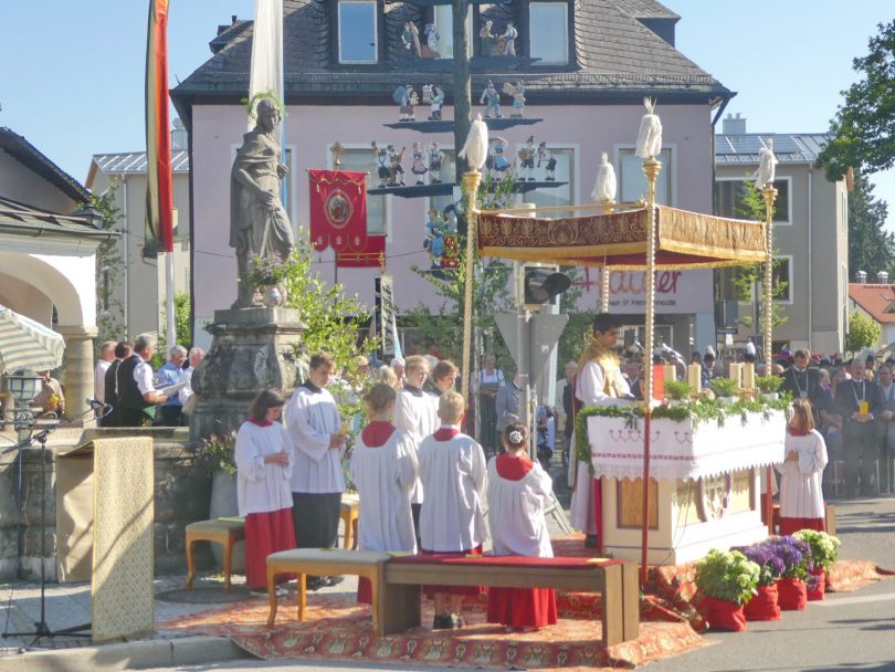 Das Fronleichnamsfest der Pfarrgemeinde “Maria Himmelfahrt” in Prien beginnt am Donnerstag, 31. Mai um 8.30 Uhr mit einer Messfeier auf dem Priener Marktplatz. Es folgt die Prozession zu weiteren aufgebauten Altären im Ortsteil Gries und am Rathaus. Sollte das Wetter ungünstig sein, ist die Messfeier um 8.30 Uhr in der Kirche, die Prozession würde dann entfallen.