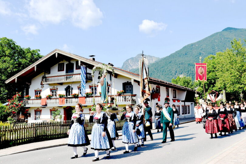 Die Fürbitten bezogen sich auf die aktuellen Krisenherde auf der Welt mit der Bitte um Beendigung des Leids und für Frieden. Der Auszug aus der Kirche erfolgte nach einem genauen Reglement der zwanzig beteiligten Institutionen. Der lange Zug machte sich mit Diakon Erik Oberhorner, der Bruderschaft mit dem Prozessionskreuz, den Trachtendirndeln, die die Figur der Muttergottes trugen, den Trägern des Himmels mit dem Allerheiligsten, den Röcklfrauen des Trachtenvereins d’Gamsgebirgler und den Kirchenbesuchern auf dem Weg zum ersten Freialtar beim Haiderhof, um den Glauben öffentlich zu bezeugen.