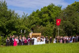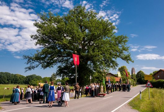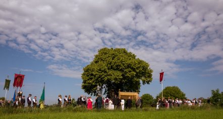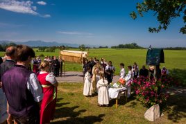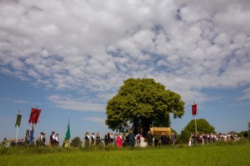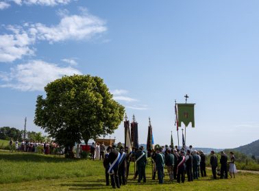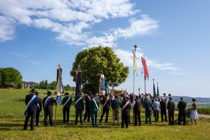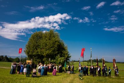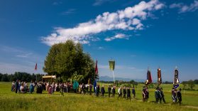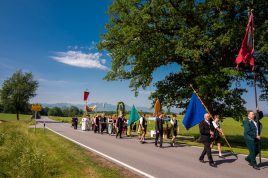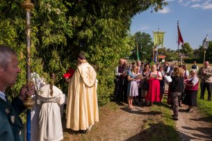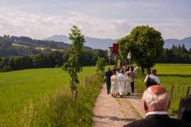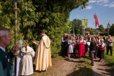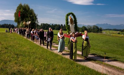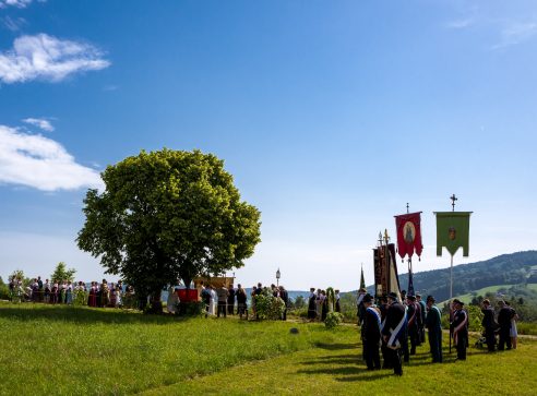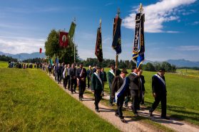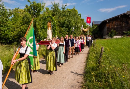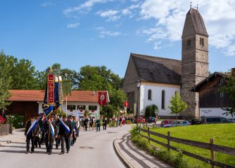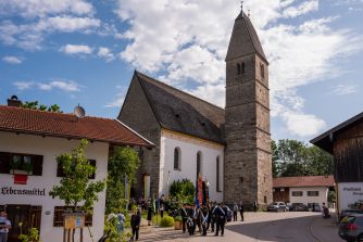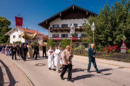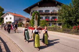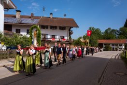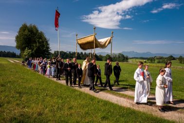 Am Fronleichnamsfest pflegt die katholische Kirche ihre eigene, farbenprächtige Formensprache als eine Demonstration des Glaubens, so auch in Hirnsberg bei Bad Endorf. Es liegt landschaftlich wunderschön auf einen Höhenzug 90 Meter über dem östlichen Teil des Simssees. Die Messe gestaltete dort Pfarrer in Rente, Herr Anton Vejtey, gemeinsam mit Pfarrer C. Kebinger. Begleitet von vielen Vereinen und Gläubigen wurde die Monstranz im Anschluß an den Gottesdienst von Pfarrer Kebinger unter dem schützenden Baldachin durch Hirnsberg getragen. Er wurde begleitet von einer Schar Messdiener mit Weihrauch und Kreuz, sowie von Kommunionkindern in Festkleidung. So marschierte man zu mehreren Feldaltären. Für viele Dorfbewohner ist die Fronleichnamsprozession einfach wichtig. Dass sie teilnehmen und ihren Glauben auch in der Öffentlichkeit bezeugen, ist für sie ganz selbstverständlich. Eine ältere Dorfbewohnerin sagte: „Einmal nicht teilzunehmen, kann sie sich nicht vorstellen – nicht, so lange ihre Beine den Weg noch mitmachen. „Das stärkt mich und gehört einfach zu mir dazu.“