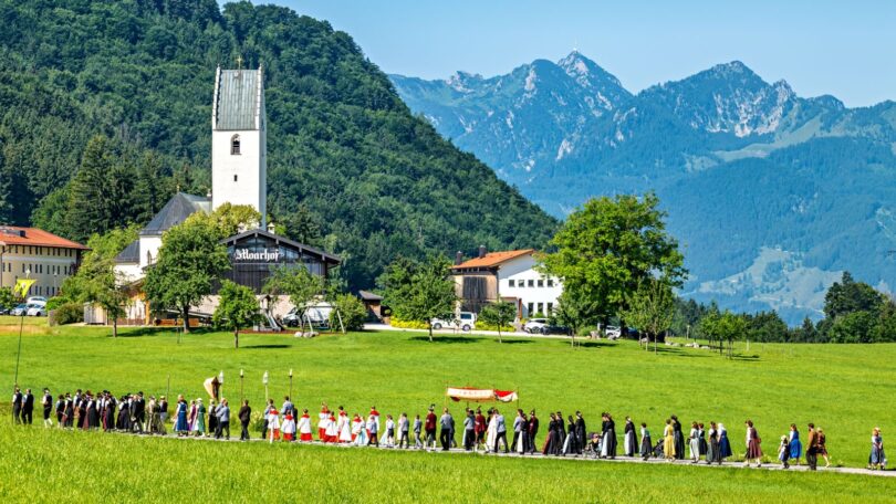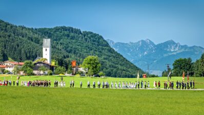 Roßholzen – Mit einem eindrucksvollen Bekenntnis zu Glaube und Gemeinschaft beging die Dorfgemeinschaft von Roßholzen am Sonntag das Fronleichnamsfest. In einem festlichen Zug durch Feld und Flur vereinten sich Vereine, Musikkapelle und viele Gläubige zu einer stimmungsvollen Prozession vor der Bergkulisse des Wendelsteins, des Heubergs und der Hochries.