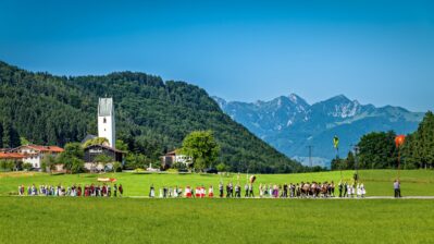 Nach dem feierlichen Gottesdienst in der Kirche St. Bartholomäus formierte sich der Zug zur Prozession. In bewährter Tradition führte das Allerheiligste, getragen unter dem Baldachin, den Zug durch die grünende Flur zum Christophorus-Denkmal. Die prachtvoll geschmückten Fahnen der Vereine und die Trachtler gaben der Veranstaltung ein würdiges, festliches Bild – vor der beeindruckenden Kulisse von Hochries, Heuberg und des Wendelstein-Gebirges.
