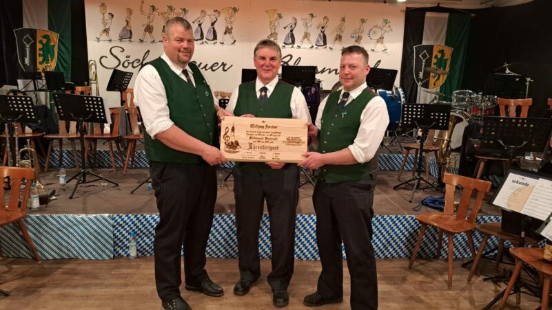 Nach der coronabedingten Pause konnten in diesem festlichen Rahmen auch einige Ehrungen nachgeholt werden. So wurde zu seiner eigenen Überraschung Wolfgang Forstner zum Ehrendirigenten der Kapelle ernannt. Forstner, der selber beim Konzert mitspielte, hatte 1988mit viel Zeitaufwand und Engagement die Kapelle ins Leben gerufen und initiierte 2001 deren Vereinsgründung. Die Laudatio hierzu hielten seine drei in der Kapelle mitspielenden Söhne. Vorab wurde das Konzert aber mit dem Konzertmarsch „Arsenal“ von Jan Van der Roost. Zweiter Vorstand Michael Süss begrüßte das Publikum und führte weiterhin humorvoll durch das Programm. Es folgte der Walzer „Flügelhornträumereien“ vom 1978 in Rosenheim geborenen Komponisten Wolfgang Probst. Hier brillierten die Solisten Kathi Seidl und Robert Wagner mit ihrem gefühlvollen Vortrag. Mittlerweile ist es schon zur lieben Tradition geworden, dass die Stücke von einzelnen Musikern selber anmoderiert werden. Und dies kam beim Publikum wieder bestens an. Mit dem Stück „Freudig Voran!“ wurde mit Sebastian Lang aus Nußdorf ebenfalls auf einen Komponisten aus der Region zurückgegriffen, bevor man mit dem Walzer „An der schönen blauen Donnau“ von Johann-Strauss jun. und einem Medley mit Hits von Udo Jürgens im Programm weiterfuhr.Es standen noch weitere Ehrungen auf dem Programm. Für 20-jährige Vorstandstätigkeit wurden mit der Verdienstmedaille in Gold Hermann Luckabauer (Erster Vorstand), August Forstner (Kassier), Robert Wagner (Zweiter Dirigent und Notenwart) sowie Martin Kirschner (Zweiter Kassier und Beisitzer) geehrt. Die Verdienstmedaille in Silber für 15 Jahre als Schriftführer erhielt Hans Forstner. Michael Süss erhielt die selbige in Bronze für 10 Jahre als Zweiter Vorstand. Für Ihre 25-jährige Verbundenheit zur Blasmusik wurden Josef Zehrer und Peter Opperer mit der Ehrennadel in Silber vom Musikbund Ober- und Niederbayern geehrt. Die Ehrennadel in Bronze für 15 Jahre konnte Elisbath Liegl, Elisabeth Görgmaier, Veronika Grießer, Christoph Huber, Josef Mitterer, Josef Traxl und Michael Purainer überreicht werden. Mit dem Leistungsabzeichen in Bronze konnten mit Katharina Pfaller und Verena Adlmaier auch wieder junge Musikerinnen ausgezeichnet werden.