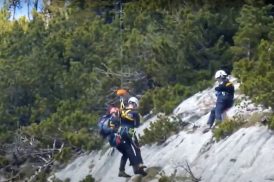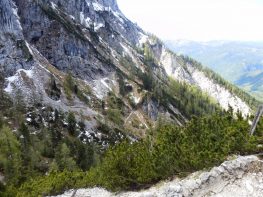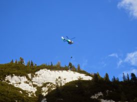 Dann treten wir den Rückweg an, denselben wie beim Aufstieg. Kurz nach dem Schrecksattel hören wir Motorengeräusche. Sie kommen von einem Hubschrauber und wir werden, bevor wir uns auf den langen Hatscher hinunter ins Tal machen, noch Zeugen eines besonderen Schauspiels: eine Bergretter-Übung.