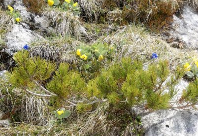 Jetzt haben wir den anstrengendsten Teil unserer Tour hinter uns, wir sind auf dem Hochplateau. Auf dem Almweg zur Traunsteiner Hütte, wo wir ständig die grandiose Kulisse der Reiteralpe-Gipfel Stadelhorn, Häuslhorn und Wagendrischlhorn vor uns haben, ist noch mehr Schnee als erwartet, aber es zeigt sich schon die Blumenpracht zwischen Latschen und Zirben, besonders schön der Enzian. Bei der Neuen Traunsteiner Hütte setzen wir uns auf die Bank vor der Hauswand und packen unsere Brotzeit aus. Beim Aufstieg sind wir niemandem begegnet, aber hier sind ein paar Bergsteiger, obwohl die Hütte geschlossen ist, sie öffnet erst im Juni.
