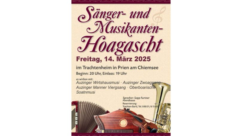 Am Freitag, den 14. März 2025, findet im Trachtenheim in Prien am Chiemsee ein Sänger- und Musikanten-Hoagascht statt.