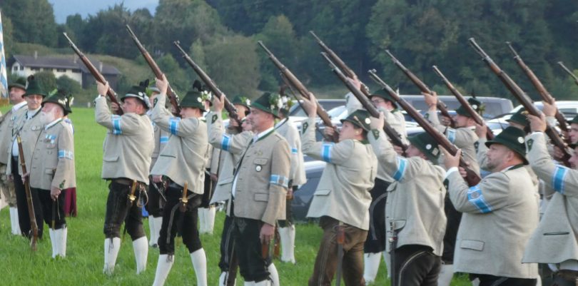 Foto: Hötzelsperger – Bildunterschrift: Die Aschauer Gebirgsschützen beim vorjährigen Jubiläum