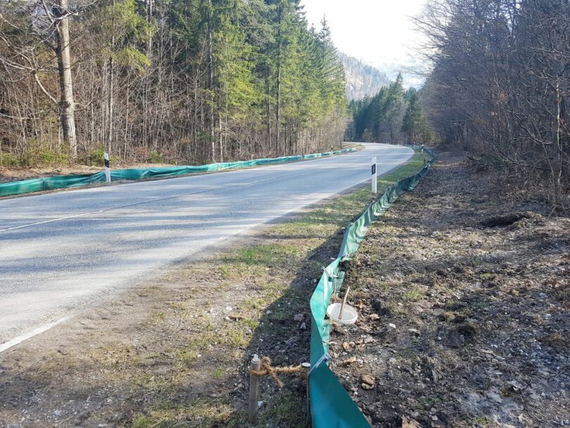 Dort, wo es keine dauerhaften Schutzeinrichtungen gibt, lässt das Staatliche Bauamt Rosenheim deshalb mobile Amphibienzäune aufstellen, um die Tiere zu schützen. Das Aufstellen übernehmen in den Landkreisen Rosenheim, Mühldorf, Miesbach und Ebersberg die Straßenmeistereien des Staatlichen Bauamtes, beauftragte Landschaftspflegefirmen sowie Naturschutzorganisationen. Möchten Amphibien die Straßen queren, werden sie entlang der Schutzzäune geleitet und landen schließlich in bereitgestellten Eimern. Darin werden die Tiere dann in der Regel von ehrenamtlichen Helferinnen und Helfern sicher über die Straße gebracht und können von dort aus ihren Weg fortsetzen.