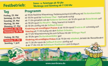 Festwirt Jochen Mörz, der das Familienunternehmen gemeinsam mit seiner Tochter Nadine und seinem Sohn Andreas führt, blickt der Veranstaltung mit besonderer Vorfreude entgegen: „Großkarolinenfeld ist für uns das erste Fest, das wir gemeinsam mit AuerBräu veranstalten. Umso mehr freuen wir uns, mit allen Besuchern dieses besondere Gefühl zu feiern. Unser Ziel ist es, das einzigartige Wiesn-Gefühl direkt nach Großkaro zu bringen und gemeinsam zu feiern.“ Die feierliche Eröffnung des Frühlingsfestes findet am Freitag, den 23. Mai, statt. Traditionell markiert der offizielle Bieranstich durch Bürgermeister Bernd Fessler den Beginn der Festlichkeiten in Großkarolinenfeld. Ein Standkonzert und der Bierausschank der Brauerei runden die Eröffnungszeremonie ab.