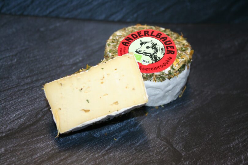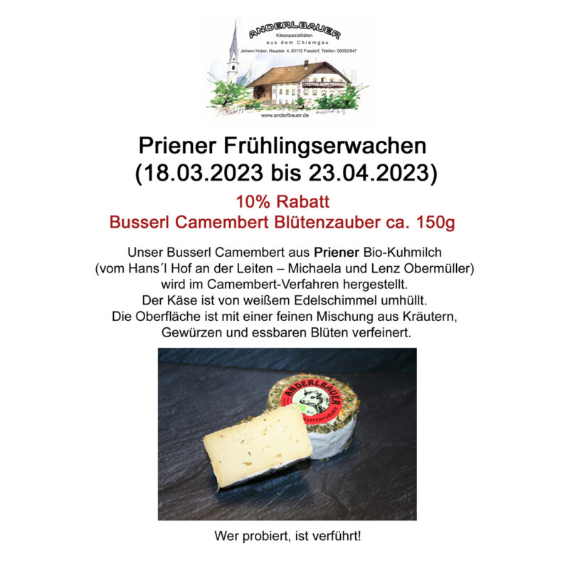 Aktion: 10 % Rabatt auf Anderlbauers Busserl Camembert Blütenzauber ca. 150 g. Der Busserl Camembert aus Priener Bio-Kuhmilch (vom Hans´l Hof an der Leiten – Michaela und Lenz Obermüller) wird im Camembert-Verfahren hergestellt. Elfenbeinfarbene, feste Struktur. Leicht süßlich-mandelartiger Geschmack. Der Käse ist von weißem Edelschimmel umhüllt. Die Oberfläche ist mit einer feinen Mischung aus Kräutern, Gewürzen und essbaren Blüten verfeinert.