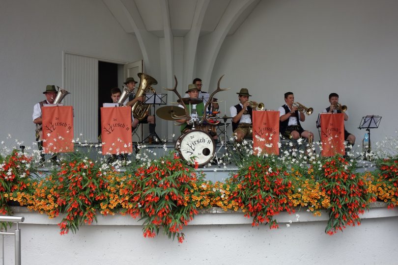 Mit Flügel- und Tenorhörnern, Bass, Ziach und Schlagzeug spielt die achtköpfige Blas- und Tanzlmusi De Hirsch´n aus Hochstätt bei Schechen am Sonntag, 4. September, von 11:00 bis 13:00 Uhr im Brunnenhof des Kurhauses Bad Aibling bayerisch-zünftig auf.