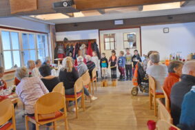 Carmen Haas, die Leiterin des „Sozialen Netzwerkes Schleching“ und ihr Team hatten die Senioren wieder zum Weihnachts-Frühstück eingeladen. Die kamen sehr gern, wenn auch nicht so zahlreich wie sonst, durch krankheitsbedingte Absagen. Liebevoll waren die Tische gedeckt, für jeden Gast gab es einen gebastelten Engel und auf den Tischen standen neben dem guten Frühstück selbstgemachte Adventsgestecke und Speisen.