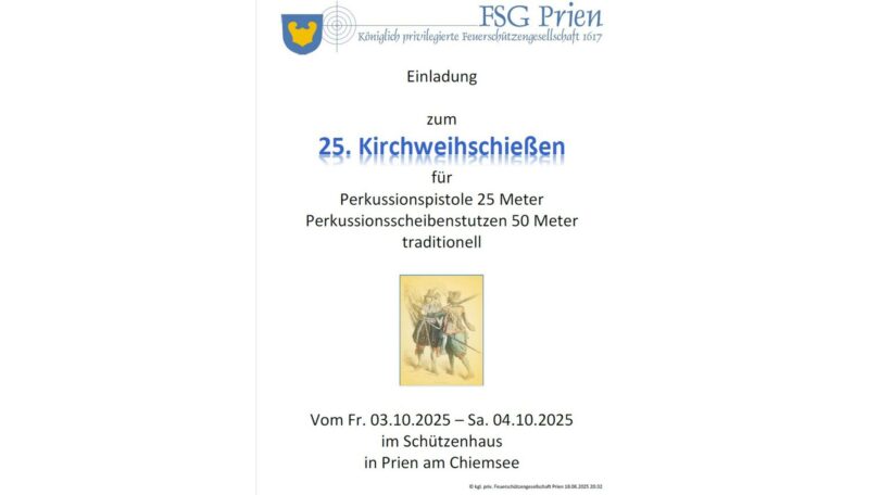 Zum 25. Mal lädt die königlich privilegierte Feuerschützengesellschaft Prien a. Chiemsee alle Schützinnen und Schützen, Freunde des Vereins und Gäste herzlich zum Kirchweihschießen ein.