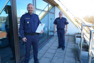 Polizeipräsident Robert Kopp bedankte sich deshalb am 18.11.20 beim bisherigen Dienststellenleiter Polizeihauptkommissar Florian Ertl für seine Leistungen im Polizeipräsidium in Rosenheim. Dabei konnte unser Polizeipräsident Florian Ertl mit Wirkung zum 01.12.2020 zum Ersten Polizeihauptkommissar befördern. EPHK Florian Ertl wurde im Mai 2016 mit der Leitung der Grenzpolizeistation Burghausen betraut und leitete diese für knapp viereinhalb Jahre stets tadellos. Der Polizeipräsident bedankte sich bei dem 44-Jährigen für sein persönliches Engagement und wünschte ihm für seinen weiteren privaten wie beruflichen Lebensweg alles Gute. Seit dem 01.09.2020 ist Florian Ertl nun stellvertretender Dienststellenleiter der Verkehrspolizeiinspektion Traunstein. Sein Nachfolger bei der Grenzpolizeistation Burghausen ist der 47-jährige Polizeihauptkommissar Karl Sanladerer. Der zweifache Familienvater wohnt zusammen mit seiner Ehefrau im Landkreis Passau und wurde zum 1. Oktober 2020 zum neuen Leiter der Grenzpolizeistation Burghausen bestellt.