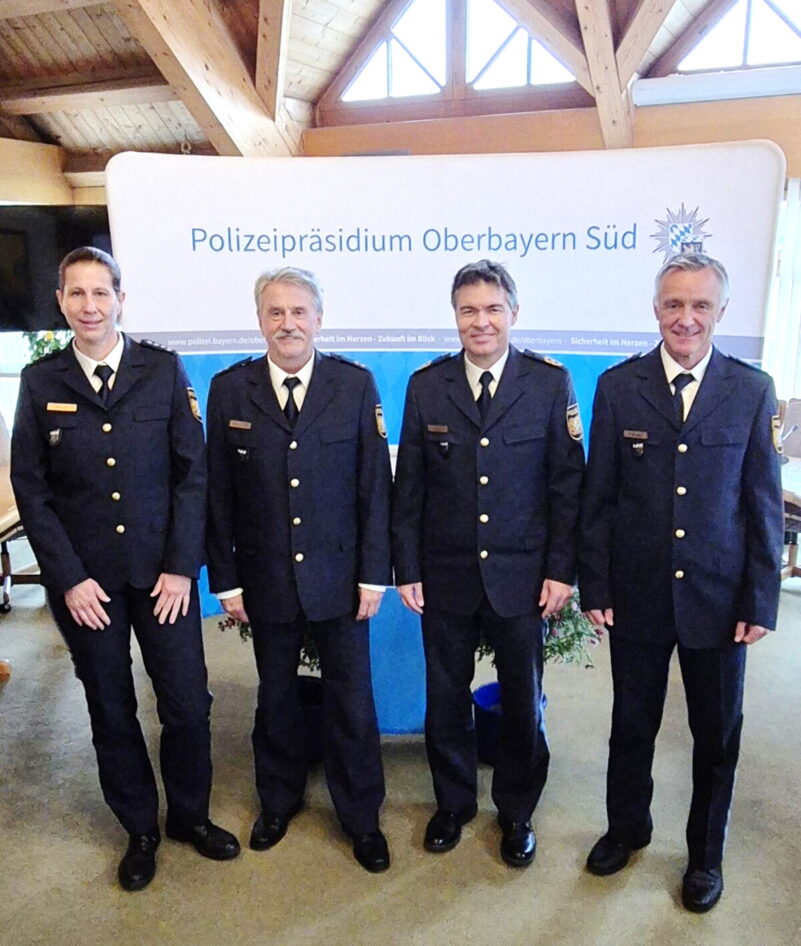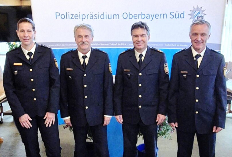Bericht und Foto: Polizeipräsidium Oberbayern-Süd – v. l. n. r.: Erste Polizeihauptkommissarin Karin Walter, Polizeioberrat Georg Nieß, Polizeipräsident Manfred Hauser, Erster Polizeihauptkommissar Jürgen Thalmeier