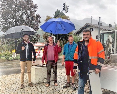 Im Mai diesen Jahres beschloss der Gemeinderat in einer öffentlichen Sitzung, dass die Ampel an dieser Stelle dauerhaft installiert werden soll. Und so geschah es nun Anfang September. Die Firma, die die Ampel bereits für den Probebetrieb zur Verfügung gestellt hatte, übernahm dabei deren Festinstallation. Vor Ort koordinierte für die ausführende Firma deren Montageleiter Matthias Brandl die Arbeiten mit. Die Bagger, Erd- und Aushubarbeiten wurden durch ein ortsansässiges Unternehmen vorgenommen, vor Ort war Anton Dirnhofer. Peter Haslreiter als Mitarbeiter des zuständigen örtlichen Stromversorgers kümmerte sich um die notwendigen Anschlussarbeiten. Zweiter Bürgermeister Johannes Weber als Bürgermeister im Dienst und Bauamtsleiter Hans Thullner, zugleich Geschäftsleiter im Dienst, waren mit vor Ort und machten sich ein Bild von den Installationsarbeiten. Sie freuten sich, dass die Ortsmitte von Unterwössen nach deren Neugestaltung in den Jahren 2015 und 2016 nun einen weiteren dauerhaften Beitrag für erhöhte Verkehrssicherheit erhält. Das Staatliche Straßenbauamt Traunstein formulierte es in einer seiner Stellungnahmen wie folgt: „Der Standort ist zentral, liegt für einen Großteil der Kinder östlich der Bundesstraße auf dem Schulweg zur Grund- und Mittelschule, bindet die Einrichtungen der Lebenshilfe inkl. Bistro und Arztpraxis gut an und ist im Zuge der B305 gut und frühzeitig erkennbar.“.