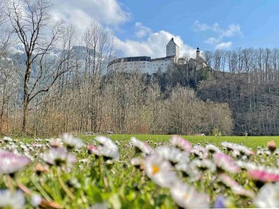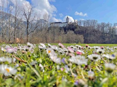 Die Wiese unterhalb des historischen Schloss Hohenaschau verwandelt sich gerade in ein Meer von Gänseblümchen. Während auf den Bergen im Priental, wie hier im Hintergrund die Sonnwendwand, noch tiefster Winter herrscht, leuchtet es weiß und gelb auf den Wiesen in Aschau i.Chiemgau. An allen Ecken und Enden hält der Frühling nun Einzug und die Leute können es kaum erwarten bis das große Erwachen der Natur im vollen Gange ist. Ja, Leben ist das mit der Freude und den Farben. Nicht das mit dem Ärger und dem Grau.