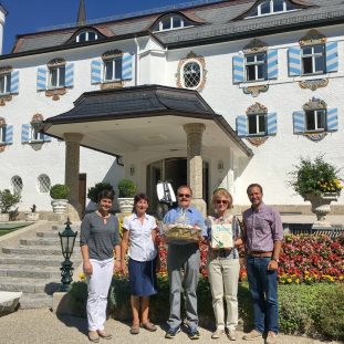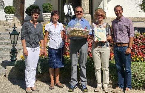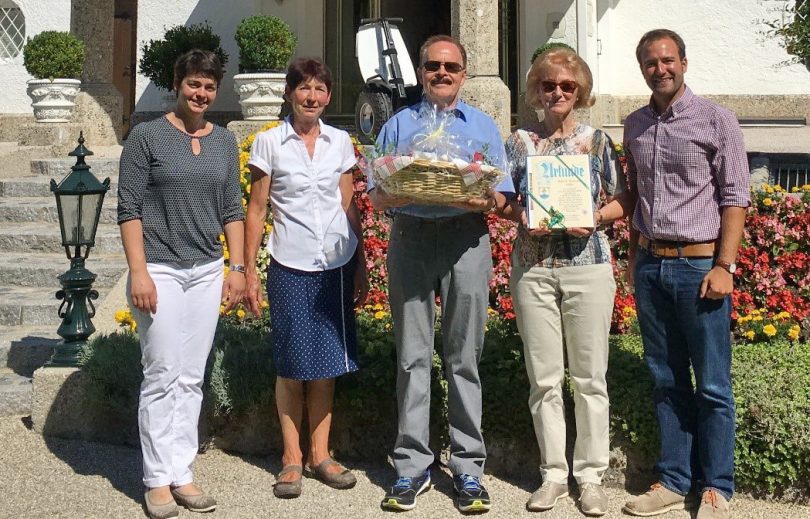 Etwas Besonderes war für die Familie Marianne und Rudi Stöber aus Reichenbach bei Stuttgart der inzwischen 30. Aufenthalt in Bernau. Im Hotel Bonnschlössl überraschten die Bonnschlössl-Besitzer-Familie Stolz, die Mitarbeiterin Maxi Schellmoser und Christoph Osterhammer als Leiter der Bernauer Tourist-Information die treuen Gäste mit einem Sekt-Empfang auf der Hotel-Terrasse. Dabei bedankte sich Christoph Osterhammer mit einem Korb voller regionaler Köstlichkeiten und mit einer Urkunde. „Nach Bernau werden wir auch in Zukunft gerne kommen, denn wir sind von der zentralen Lage, von den Fahrradtouren-Möglichkeiten, vom Blumenschmuck und von der bayerischen Gemütlichkeit fasziniert“ – so die Gäste beim Empfang.