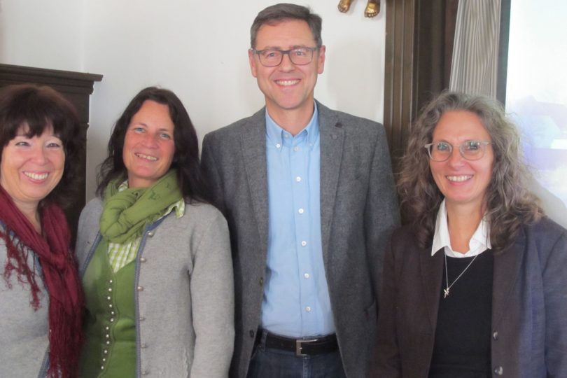 Dr. phil. Bernd Steidl (Archäologische Staatssammlung München), rechts Christina Pfaffinger (CAT-Geschäftsführung), links außen Dagmar Mayer (CAT Gruppen/Gästeführer) und Astrid von Rauhecker (CAT InfoCenter/Gruppen) in der himmlischen Stube der Klostergaststätte auf der Fraueninsel.