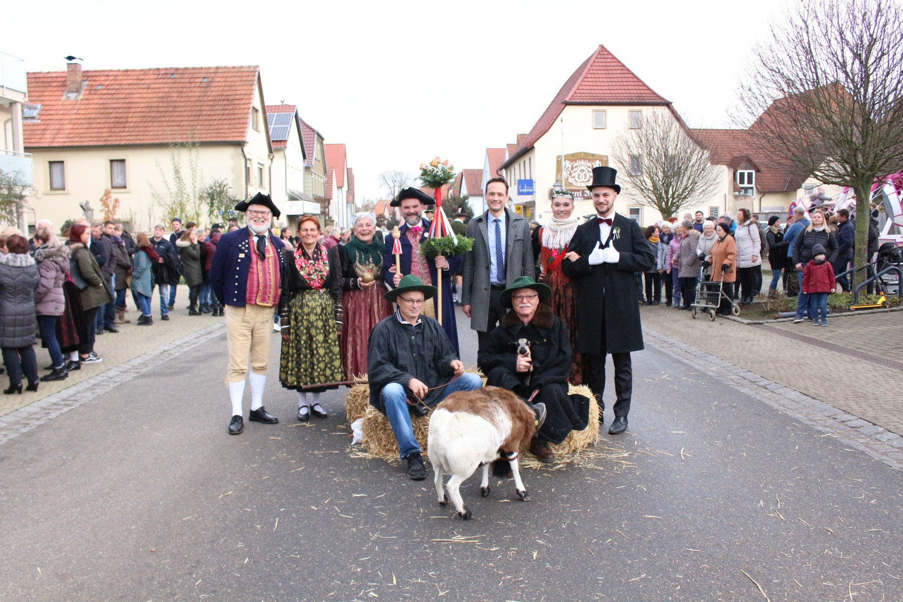 Wilfried Brust (Ehrenvorstand), Renate Moreth (Vorsitzende), das Hemmelkönigspaar Ida Bartenstein und Oliver Brust, Landrat Florian Töpper, das scheidende Königspaar Lara Heymanns und Kevin Heßler sowie die beiden Kerwaschaffer Bernhard Behr und Winfried Huppmann (Foto: Franziska Schlemmer)