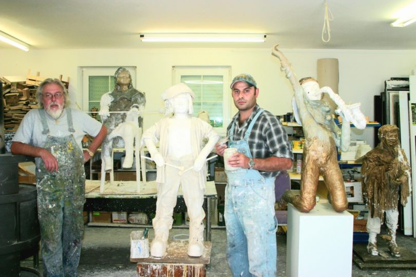 Oh ja! Im alten Atelier gegenüber zeigte er mir, wie man millimetergenau Passepartouts ausmittelt und schneidet. Feinarbeit. Später habe ich ihm die Farben hergerichtet. Und auch das Pinsel reinigen mit Terpentin war ihm sehr wichtig. Nach drei Lehrjahren war ich selbstständig, baute seine Ausstellungen auf und wieder ab, es war wirklich viel Arbeit! Und später habe ich angefangen, seine Bronze-Skulpturen mitzugestalten: Den St. Prosper in Erding zum Beispiel und die Epochalkugel am Audi-Forum beim Münchner Flughafen.
