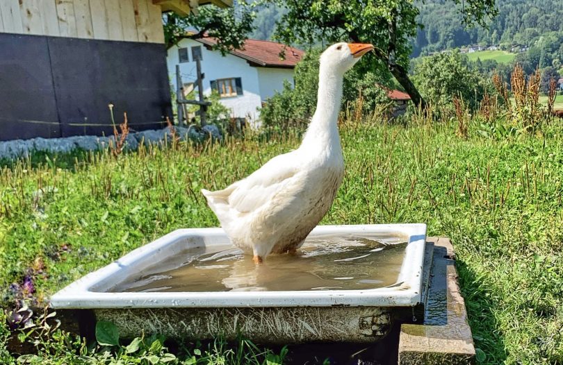 Die warmen Temperaturen der letzten Tage lassen einen schon mal zum Schwitzen bringen. Sich in den Schatten verziehen und alle viere von sich strecken ist da sicher ein guter Tipp. Wie es jedoch auch gehen kann, zeigt uns dieser gefiederter Zweibeiner. Ins kühle Nass steigen und sich erfrischen wie diese Hausgans in Aschau i.Chiemgau ist dabei natürlich auch die richtige Entscheidung. Dabei noch ein bisschen schnattern, so lassen sich die derzeitigen Sommertage perfekt genießen.